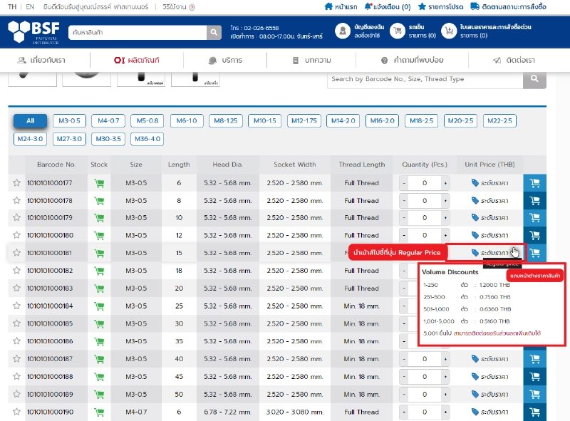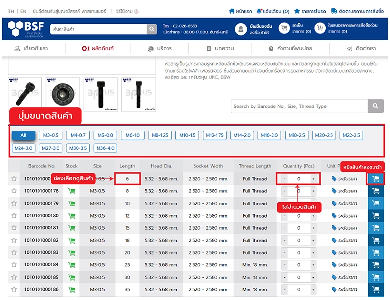 เลือกสินค้าที่หน้าผลิตภัณฑ์ เมื่อกดเลือกสินค้าแล้วให้สังเกตช่วงด้านล่างของภาพสินค้า จะมีปุ่มขนาดสินค้าให้ผู้ใช้กดเลือก เมื่อกดเลือก ผู้ใช้สามารถเลือก ดูขนาดสินค้าที่ช่อง Size ( d x l ) เมื่อเลือกขนาดสินค้าได้แล้ว ใส่จำนวนและกด Add to My Cart เพื่อหยิบสินค้าลงตะกร้า และเข้าสู่การชำระเงิน